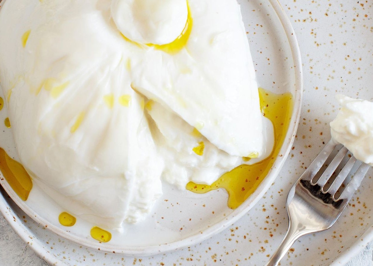 The first time you see a burrata sitting on a plate, tilted, you might be perplexed. Burrata is as white as mozzarella but comes with a strange narrowing at the top, like a giant dumpling. With a knife and fork, you poke the pouch, knowing something hides below that initial cheese layer.