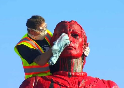 As thousands of people enjoyed Italian Heritage Day celebrations in San Francisco's Little Italy, public works crews were scraping red paint off the city's statue of Christopher Columbus just a few blocks away. The inscription painted at the base of the statue, near Coit Tower, was especially disturbing: "Destroy all monuments of genocide and kill all colonizers."
