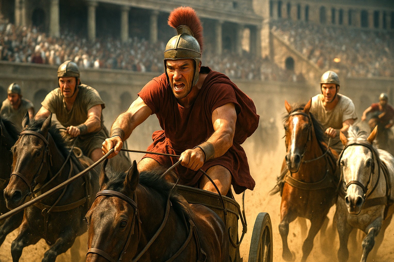 Stretching between the Palatine and Aventine hills, the Circus Maximus was Rome’s largest entertainment venue. Its main attraction was chariot racing, the sport most Romans followed with passion: teams were divided by colors – Blues, Greens, Reds, and Whites – and fans showed allegiance with – sounds familiar? – clothing, bets, and loud support.
