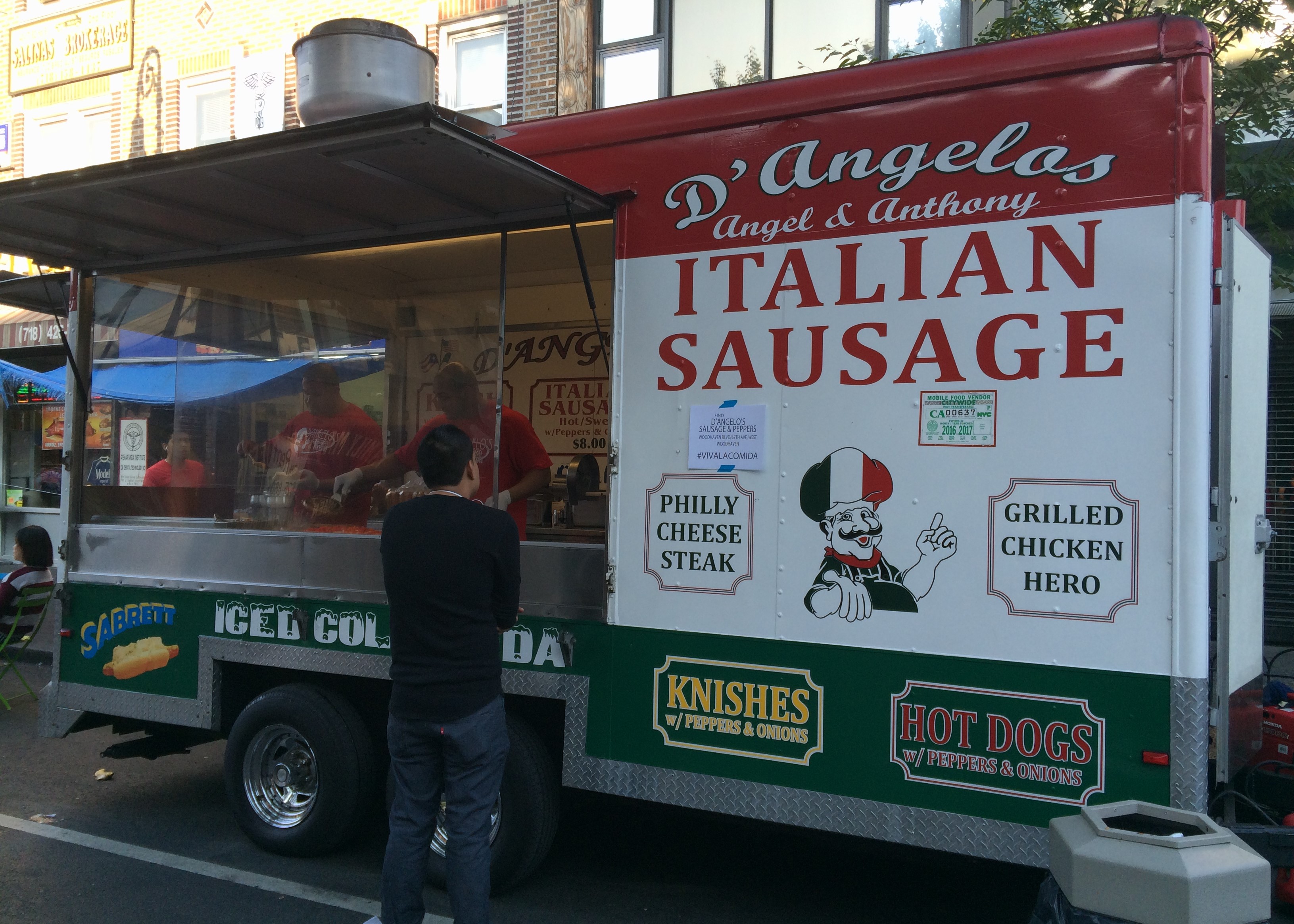 The setting of the D’Angelos Italian Sausage truck presents a dramatic contrast. Monday through Saturday, the truck parks in a long-established spot on Woodhaven Boulevard, on the border between two largely residential neighborhoods, Middle Village and Rego Park, beside the green expanse of St. John Cemetery.