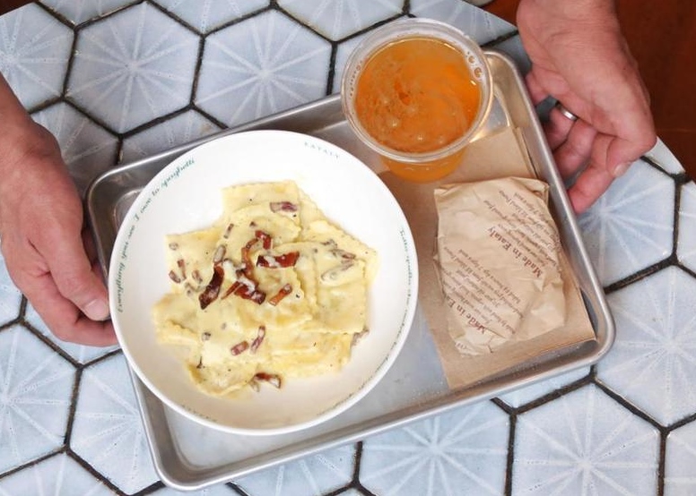 While peak lunch hours draw a popular salad-bar like line at the counter in the far corner of the store, the limited, well-curated options at the ravioli window free your ordering anxiety and allow you to choose between a ricotta and spinach filled ravioli in tomato basil sauce ($11.80); a seasonal pea, mint and pecorino round ravioli in Parmigiano Reggiano sauce ($12.80); and a premium Prosciutto di Parma ravioli in the sugo di giorno, ranging from carbonara to Amatriciana to Sicilian-style pesto and beyond ($13.80).