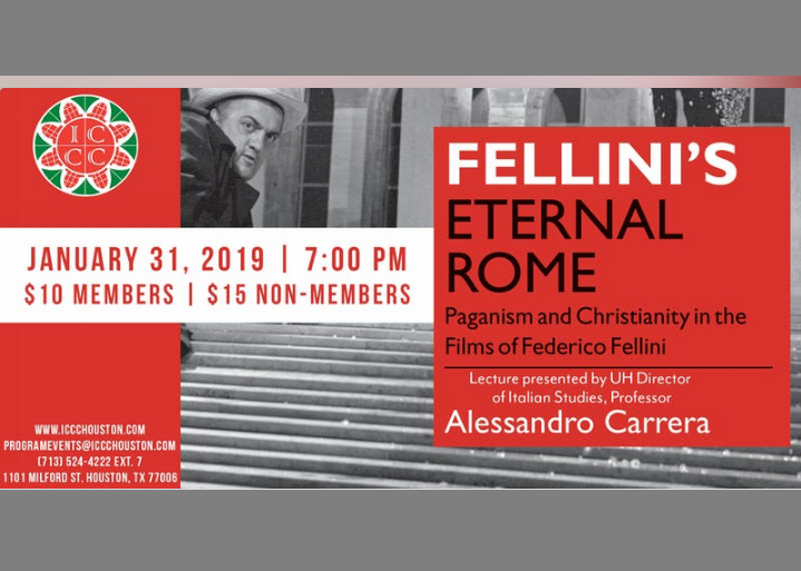 Join us for a special presentation on "Fellini's Eternal Rome: Paganism and Christianity in the Films of Federico Fellini", a recently released book authored by Professor Alessandra Carrera from the University of Houston. Copies of his book can be purchased on Amazon or online at Barnes and Noble. Copies will not be for sale at this event.
