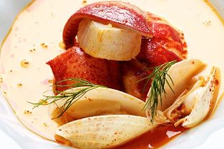 But guess what? Senior is out-cooking junior right now, the evidence arriving with a treat from the kitchen that's as much architecture as "benvenuto": a candle-lit tower supporting a delicate cup of warm prosecco zabaglione and gingery oysters, the richness of the frothy custard cut with lemon zest. There's no more arresting seafood carpaccio in the city than Fiola's pink brick of Himalayan salt carpeted with sliced Maine scallops, pansies and a smear of ramp pesto.