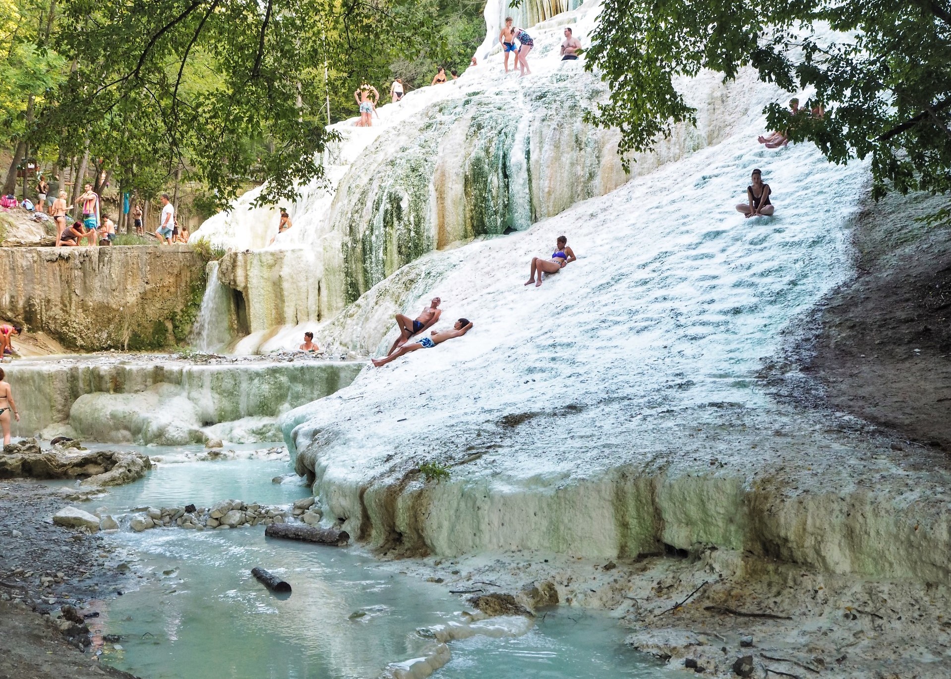THESE GORGEOUS HOT SPRINGS ARE a must-see for anyone visiting Tuscany. A wooded path leads you to the secluded pools surrounded by trees. The colors are simply spectacular, and when the weather is nice, you can find Italians and tourists climbing to reach different pools on the hillside.