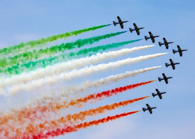 The Frecce Tricolori, literally "Tricolour Arrows", are the aerobatic demonstration team of the Italian Air Force and are among Italy's best known national symbols. The military jets, famous for emitting plumes of the three colours from the Italian flag, take to the skies to mark important events and public holidays in Italy, including Festa della Repubblica on 2 June.