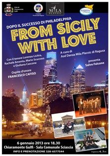 Lo spettacolo segue l'analogo già messo in scena recentemente, nel novembre 2012, a Philadelphia negli Usa, dove ha riscosso un enorme successo presso un vasto e competente pubblico di italoamericani. Ora "From Sicily with love" è stato riproposto con un cast ancora più ricco di artisti, pronti a sciorinare bel canto, danze, coreografie, virtuosismi strumentali, con uno spettacolo che vuole essere un piccolo contributo di ottimismo in un quadro collettivo segnato da una strisciante tristezza e da un pessimismo nemmeno tanto velato.