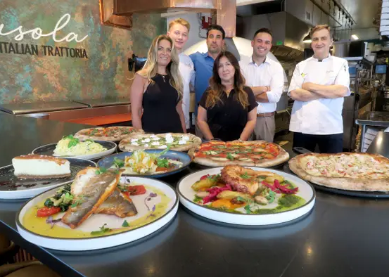 The team behind Isola, a new Italian restaurant in Beach Haven. From left to right in the back appears executive pizza chef Dylan Walenciak, co-partner Mario Famularo, general manager and co-partner Tony Marinho, executive chef Ermelindo Firmani, and (in front) team members Rosa Luisi and Marysol Duffy.