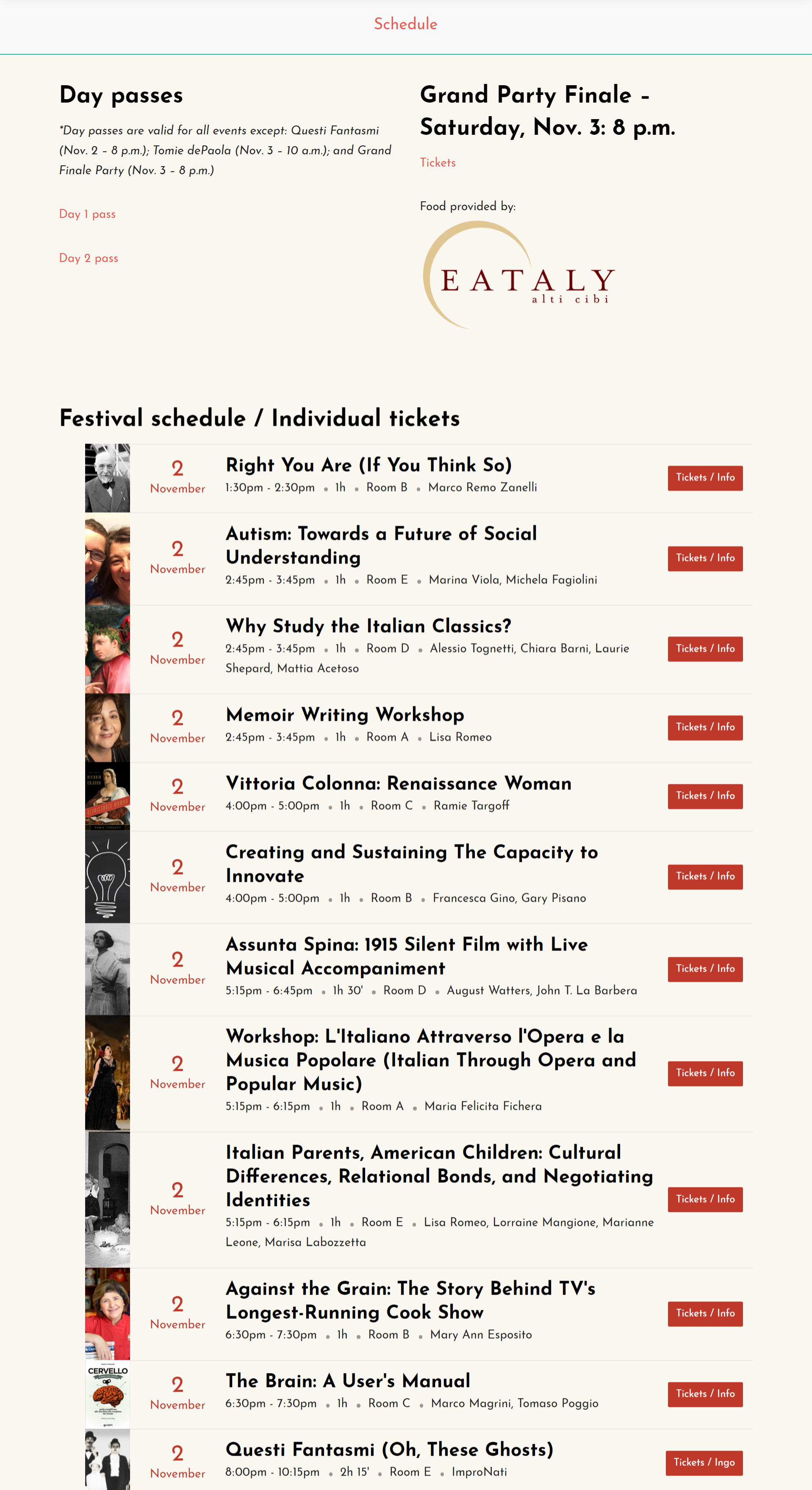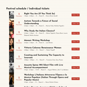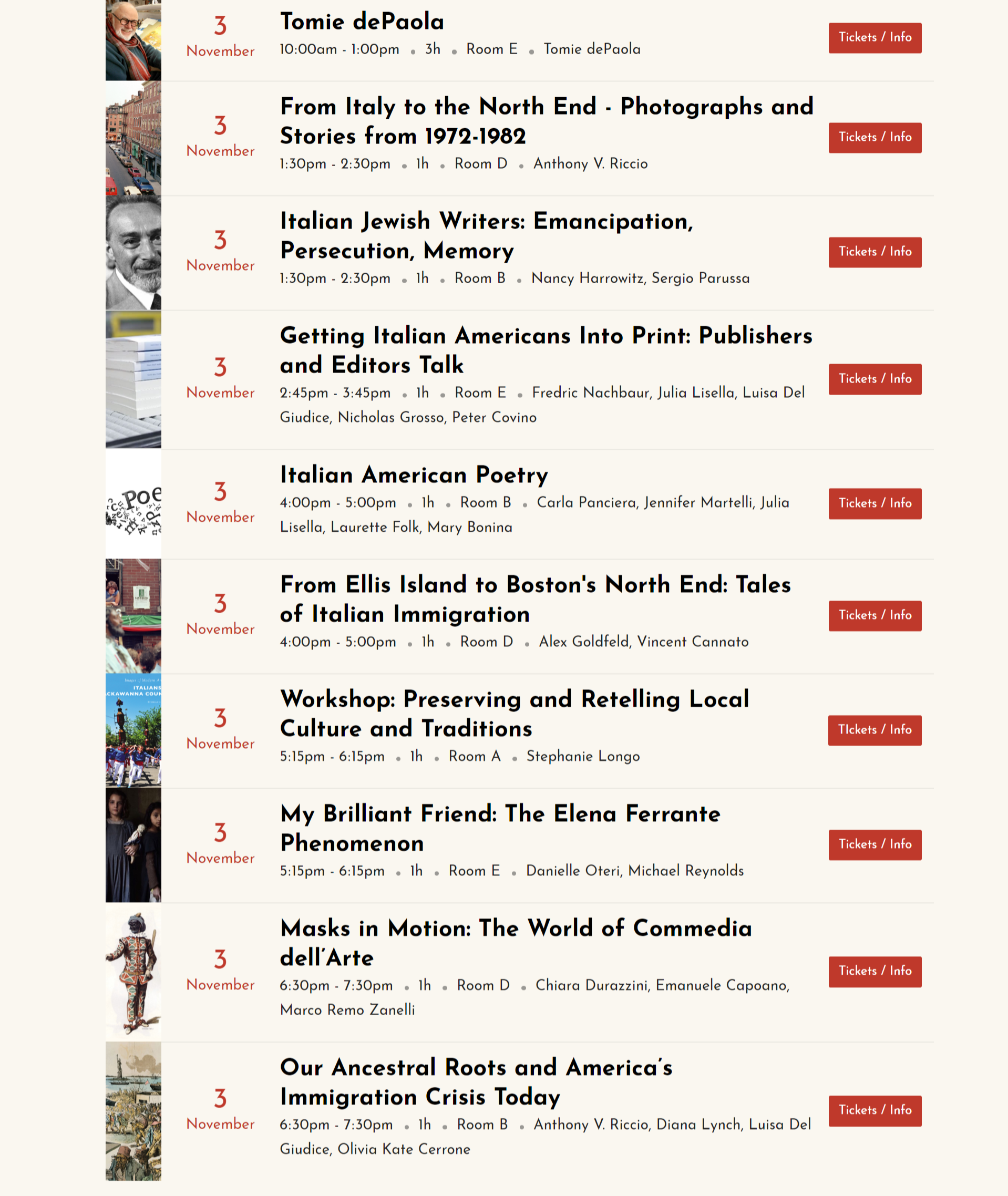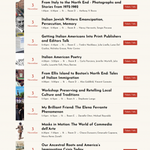 On Nov. 2 and 3, we will hold panels and presentations on a wide range of topics, all dealing with some aspect of Italian or Italian American culture. Identity and immigration are central themes throughout the festival, but we also have talks on dual language education, the importance of Italy’s literary classics, Pirandello, Commedia dell’arte, and the Elena Ferrante phenomenon. There will be panels on autism, innovation, and the brain, all led by Italian authors and scholars. But we don’t limit ourselves to presentations and panels; there are also a theater play (Edoardo De Filippo’s Questi Fantasmi) and a silent film screening with live musical accompaniment (Assunta Spina). Some big names coming to visit us include beloved children’s books’ author Tomie dePaola, Ciao Italia host Mary Ann Esposito, and actress Marianne Leone. The festival will end with a big party and celebration on Nov. 3, with food from Eataly Boston and live music.