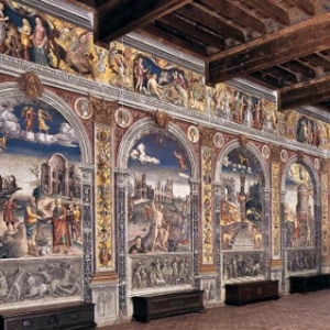 The second, much more interesting mystery, is that a room in the Palazzo Della Rovere in Rome, named "of Penitentiaries", painted by Pinturicchio and now very pale, is pretty much the source of inspiration for the whole cycle, but no one has yet discovered what kind of relationship there was between the two buildings, and especially between the two clients of the works. For sure it is not a simple copycat by Falconetto to the work of Pinturicchio, because at those time the client, not the artist, was the one to decide the theme of the artistic work. So it's unlikely that such a refined and particular iconological choice had been entirely taken and copied without a real relationship between the two places, or between the two client families.