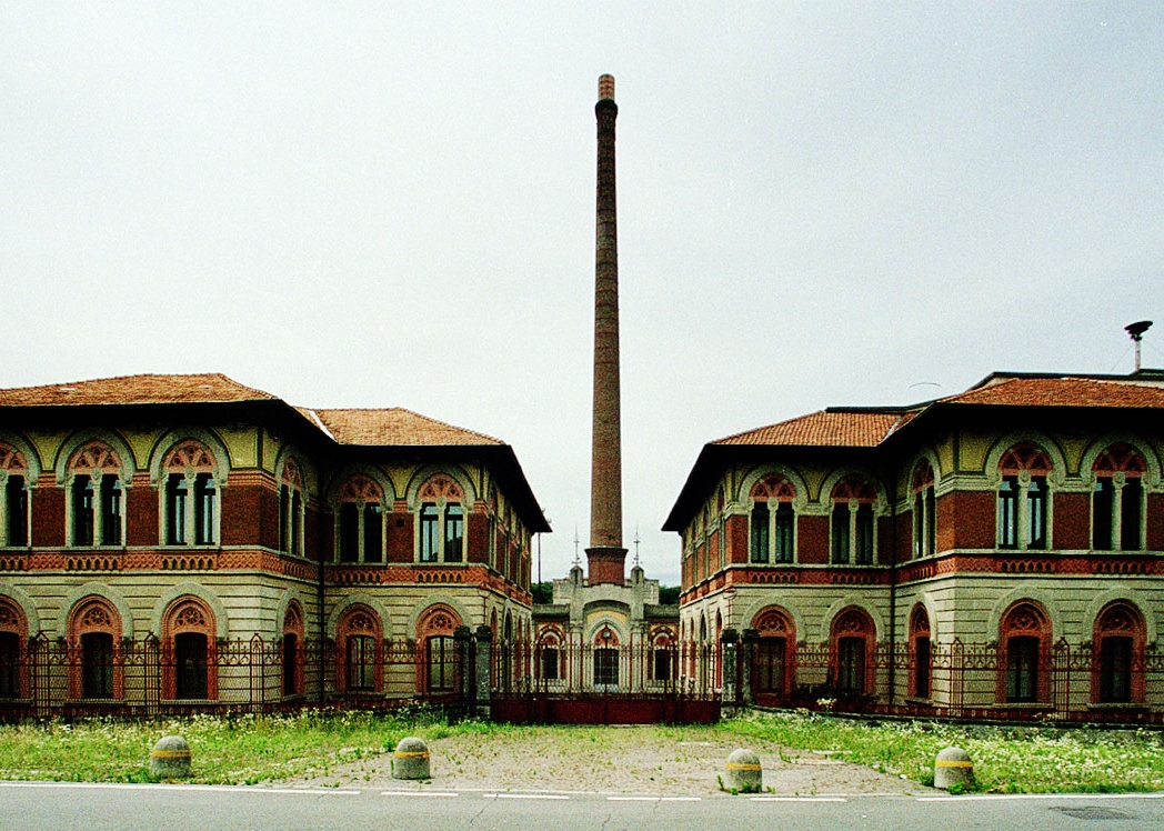 The village’s urbanistic aspect derived primarily from the presence of the factory, built along the main roadway. The factory is in the neo-Medieval style, with a splendid central entrance rich in decorative elements, and particularly tall smokestacks. Meanwhile, its warehouses are distributed in an orderly fashion along the main road; they are refined, with brick contours and friezes made up of eight-pointed stars. Finally, rose windows done in terra cotta embellish each facade.