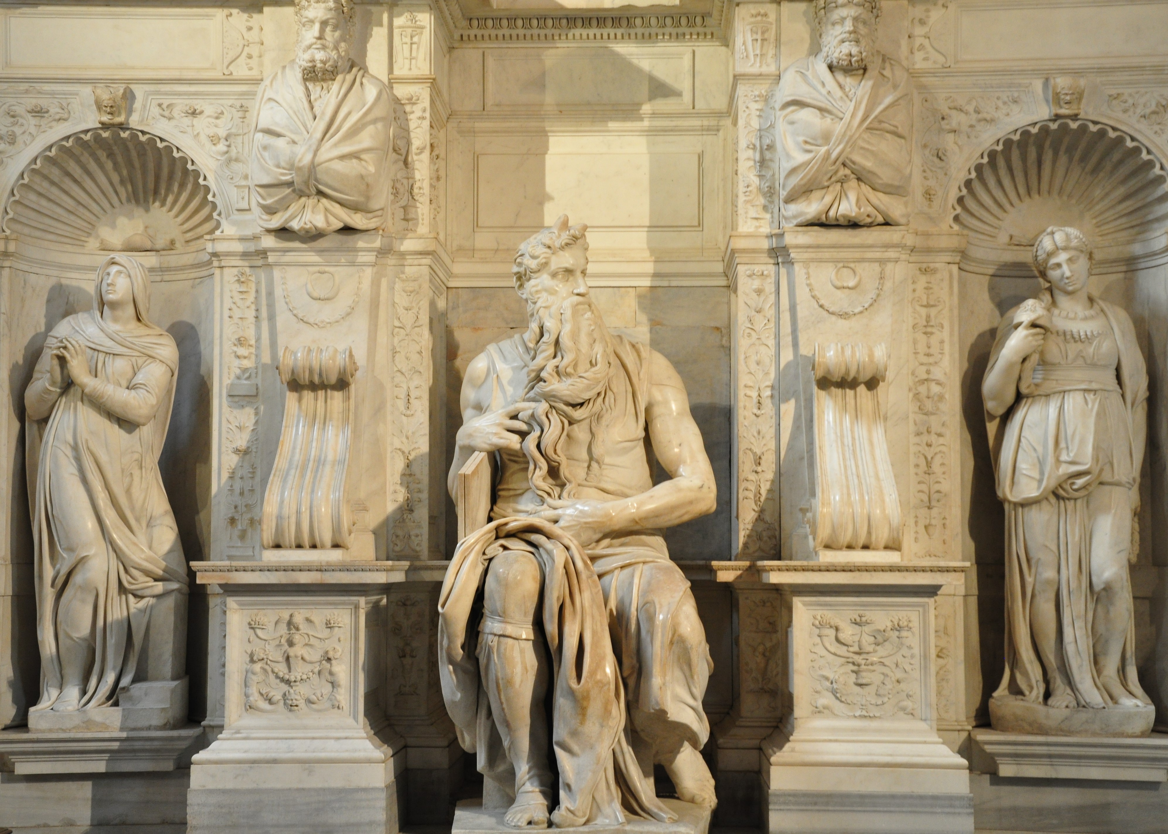 The work inspired by Raphael and Donatello, depicts a majestic Moses sitting with the Tablets of the Law under his arm, while his other hand fondles his long beard, which according to Vasari was carved with such perfection that it seems more a "work of brush than chisel".