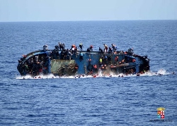 The Italian navy said its Bettica patrol ship was responding to a migrant ship in distress when it flipped. A photo of the capsized boat taken by the navy showed migrants scrambling up the side of the overturned ship, perching precariously on the exposed side as they awaited rescue, with hundreds more floating in the sea. Crews tossed life jackets to those in the water and brought 500 to safety, the navy said in a statement.