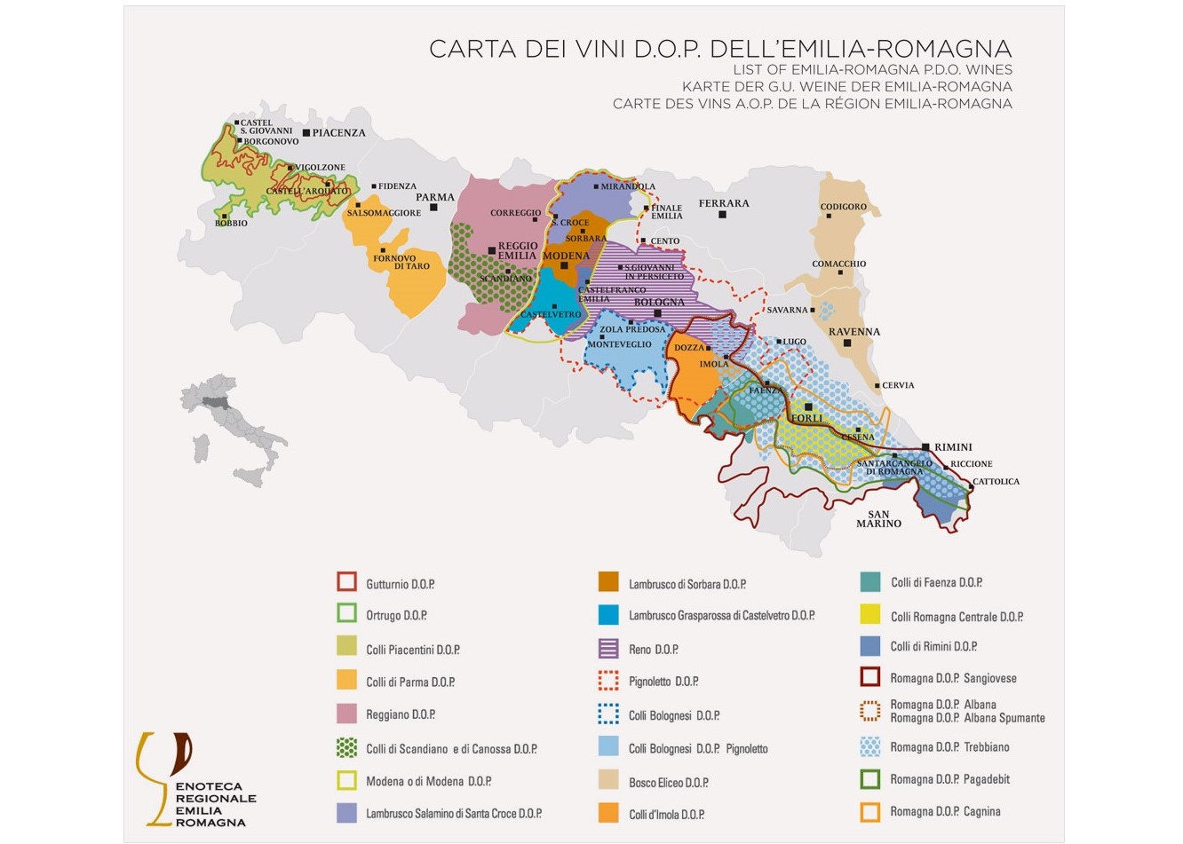 Located in northern Italy, Emilia-Romagna is a prolific wine region covering more than 136,000 acres under vine (2010). The 15-mile area spans almost the entire width of the northern Italian peninsula and is located between Tuscany (to the south) Lombardy and Veneto (to the north) and the Adriatic Sea (to the east). This unique region is the only part of Italy with both east and west coast borders.