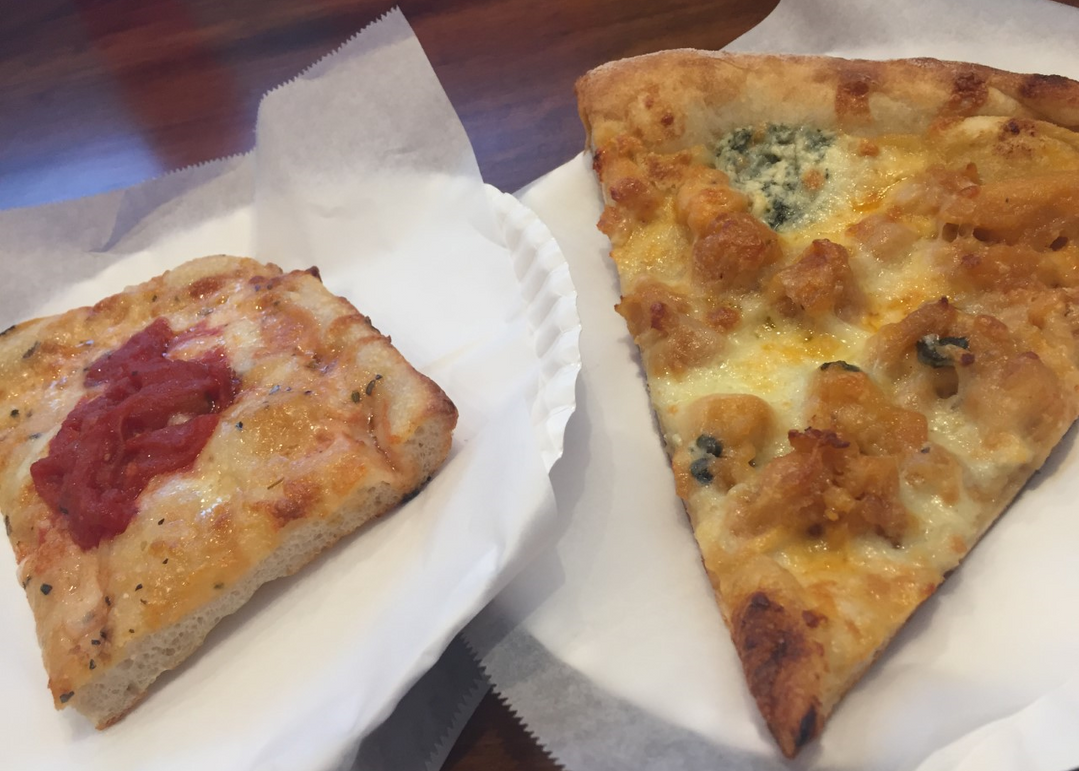 The interior space has a distinct pizzeria vibe, but the aesthetics are thoughtful and well executed, finding a comfortable spot on the spectrum between upscale bistro and casual sidewalk cafe. If you plan to order a pie or other entree from the menu, they will seat you in either the front dining area or the rear space near the bar. If you’re just looking for a slice, you’ll need to order that at the counter, and from there, you can either enjoy it at a separate counter space across from the kitchen or get it to go.