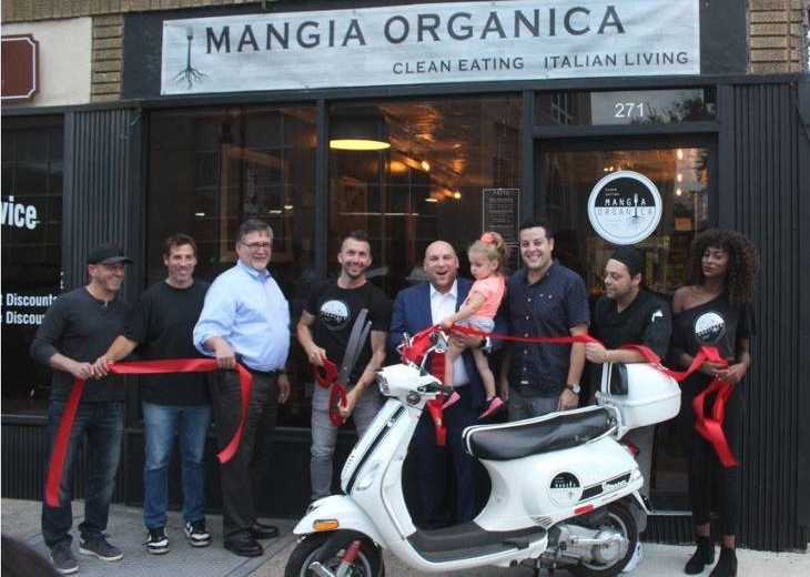 Mangia Organica owner Valentino La Rosa and business partner Andrew Martino were joined by Township Administrator Matthew Watkins, Mayor Michael Venezia, Ella Venezia, and friends for the ribbon cutting and official opening of Mangia Organica on Bloomfield Center's Restaurant Row on Glenwood Avenue Thursday night.