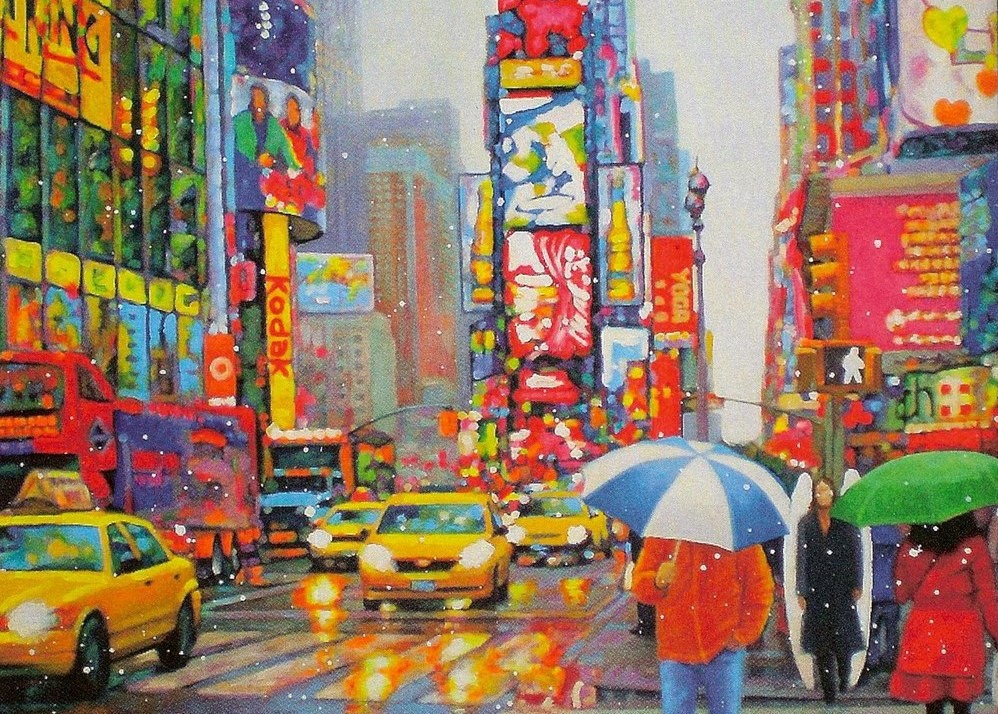 The angel, a seemingly common man recognizable by his wings, transforms himself into a messenger of sharing and help, since he is suitable for an empathetic, positive and generous relationship which mutates, without notice, into perceivable reality. The theme is always inserted into an urban context of big or small cities, never into a rural or landscape environment, always depicted in rich in bright colors, where cars, roaring motorcycles, buses and metro symbolize the technological development and the dynamism of human progress, but also the alienation of contemporary life.