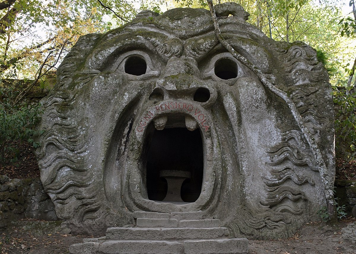 The slanted terrain it is built on was originally destined to an ironic homage to Villa Farnese, an opulent and beautiful mansion nearby whose huge gardens and sculptures are the textbook example of Renaissance style. Prince Orsini, owner of the grove, had the idea of contrasting the geometric elegance of the famous villa with a Mannerist triumph of oddities – starting with the shape of the terrain itself – including unusual art and architecture.