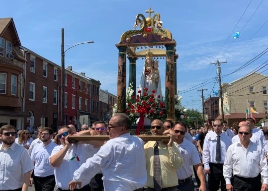 The MSS Feast, which is highlighted on Sunday Aug. 14 by the traditional street procession through the east end of Norristown, with 25 people carrying a statue of the Blessed Virgin Mary, continues a vow made by the ancestors of the Norristown descendants of Sciacca, whereby the people would promise to honor the Virgin Mary because of her intercession in the ending of the Black Plague in Sicily over 500 years ago.