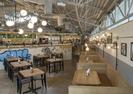 The 6,000-square-foot space seats 170, and has been renovated to highlight the industrial style of the 70s era building, featuring nostalgic design elements reminiscent of institutional architecture of that period in time, officials described: "Subway tile, cement flooring, blackboards, and a 'subway platform' in the central dining area evoke the unmistakable style of iconic New York City public spaces."