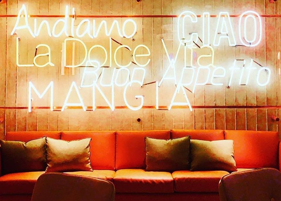 The Venetian space, which only serves dinner until Jan. 4, includes a bar with its own menu, something not offered in Los Angeles. Architect Thomas Schlesser of Design Bureaux created the look of the 152-seat restaurant the features a palette of orange and forest green with reclaimed wood tables. Art Deco-style light fixtures, concrete walls, and gray banquettes are found throughout the space.