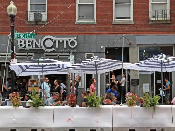 While it “may craft additional neighborhood-specific guidelines” later, the City of Boston said the North End could only have tables on sidewalks, not in streets. The city said that, in part due to the North End’s density of restaurants and narrow streets and sidewalks, on-street dining permits would not be issued. Other concerns were resident parking scarcity and high foot traffic.