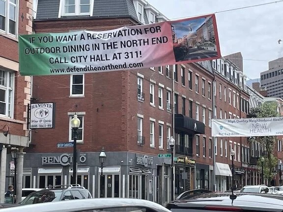 One banner seen Monday read “If you want a reservation for outdoor dining in the North End, call City Hall at 311!” There was also another banner that said “No more outdoor dining bans!” according to MassLive. Jorge Mendoza, owner of Monica’s, said there were four banners in the North End criticizing the city’s decision to restrict the neighborhood from outdoor dining.