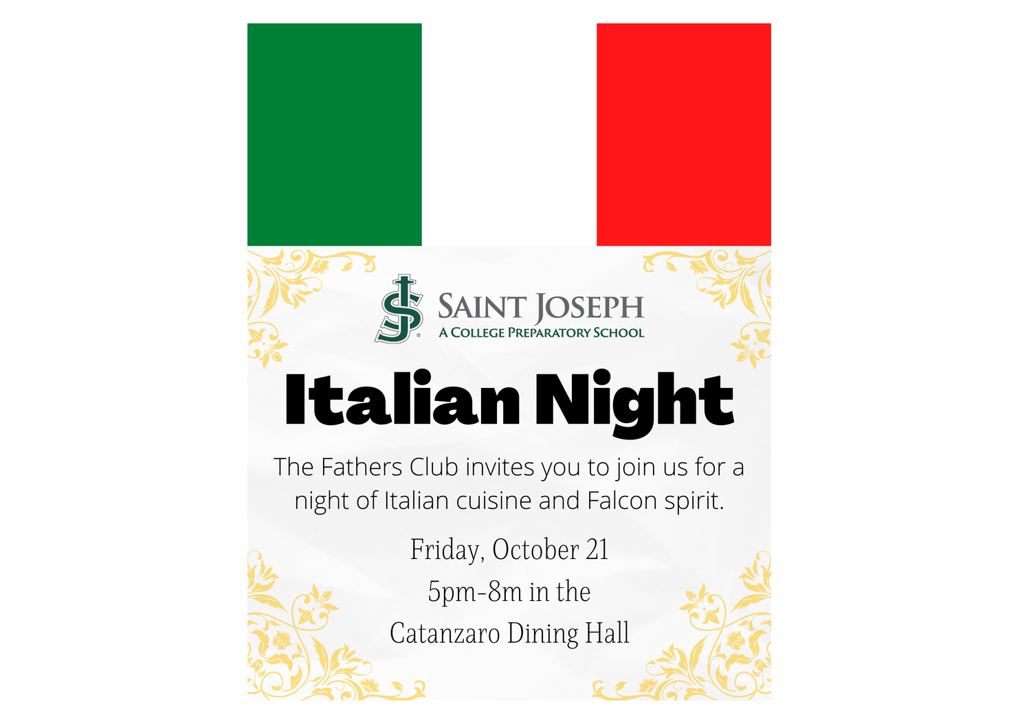 The Saint Joseph Fathers Club is proud to announce a new community event - Italian Night - coming to the Catanzaro Dining Hall on Friday, October 21. A wide variety of Italian dishes will be cooked and served by the fathers of Falcons past and present. Doors open at 5pm and close at 8pm.
