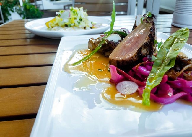We started with their version of an Aperol Spritz (gin, Aperol, lemon juice, and Prosecco). Our server was chef Garret Meyer, and he suggested we start with Cicchetti, which are small snacks or side dishes (think Spanish tapas). The Cicchetti menu is changed weekly and our selection was a tour of Italy with a nod to Colorado — burattini (homemade soft mozzarella) with pesto, deviled eggs, Palisade Peach tart, and a sun-dried tomato tapenade crostini.