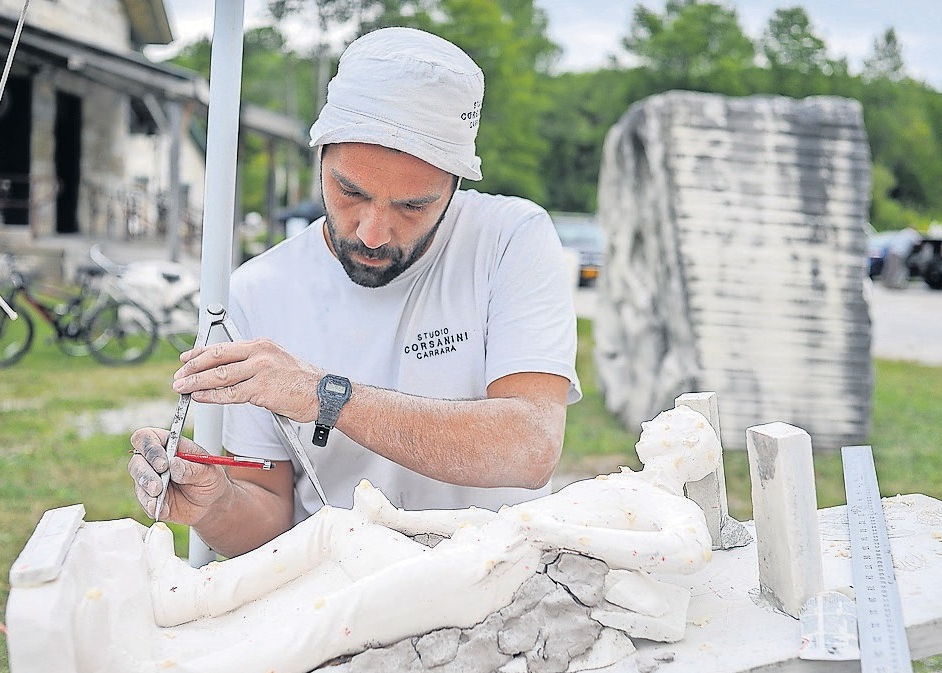 A man slowly took shape beneath a pair of grinders. Italian sculptors Alessandro Lombardo and Andrea Ingrassi worked at the Carving Studio and Sculpture Center Friday on “Stone Legacy,” a statue of a stone worker commissioned by Mark Foley and Green Mountain Power, intended to be the first in a series of sculptures placed in downtown Rutland. Work is expected to continue through next week.