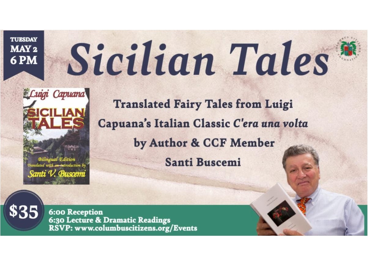 on Tuesday, May 2 for an enlightening presentation by CCF Member Santi Buscemi on the fairy tales of Luigi Capuana. Buscemi's book, Sicilian Tales, translates nineteen fairy tales from Capuana's C'era una volta.While you can expect to meet traditional characters in these fairy tales, Capuana's style infamously features strange and surprising elements especially in each tale's ending. A dramatic reading of at least two of the tales, aimed at an adult audience, will be sure to pique your interest! The reception begins at 6PM followed by the presentation at 6:30PM.