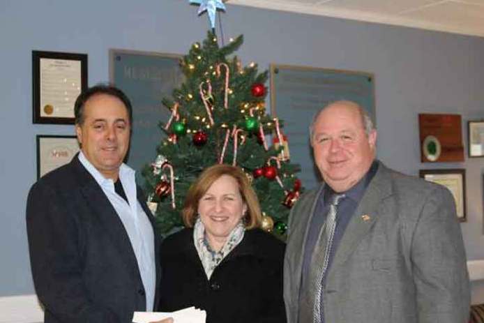Joe Jannarone, President of Sons of Italy Lodge 2561 of Parsippany, and Mayor James Barberio are seen presenting gift cards to Regina Braham. Regina is the Director of Community Relations for Jersey Battered Women's Service (JBWS). Sons of Italy has been supporting the charitable needs of JBWS and other organizations for years and continues to provide them with gift cards for those who are in need of assistance.