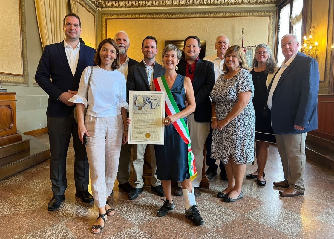 The City of St Louis Resolution was sponsored and signed by Alderman Joe Vaccaro of the 23rd Ward and Alderman Joe Vollmer who represents The Hill neighborhood. President of the St Louis - Bologna Sister Cities, Michael J Cross, presents Deputy Mayor Anna Lisa Boni with a Resolution of the City of St Louis at the City Hall of Bologna, Italy.