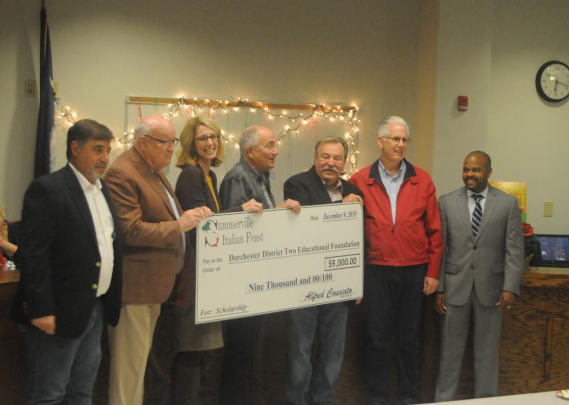 The Summerville Italian Feast donated $9,000 to the Dorchester District 2 Education Foundation. The Summerville Italian Feast gave the check to Education Foundation founder Jennie Crosby and board chair James Weaver at the Dorchester District 2 school board meeting on December 9th.