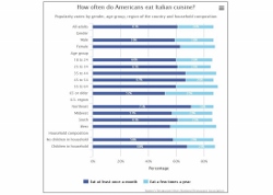 Sixty-one percent of the 1,000 people surveyed by the NRA said they eat Italian food at least once a month, and 26 percent said they eat it a few times a year. By comparison, the other two of the "big three" ethnic cuisines in the United States, Mexican and Chinese, were eaten at least once a month by 50 percent and 36 percent of those surveyed, respectively, and a few times a year by 31 percent and 42 percent of respondents, respectively.