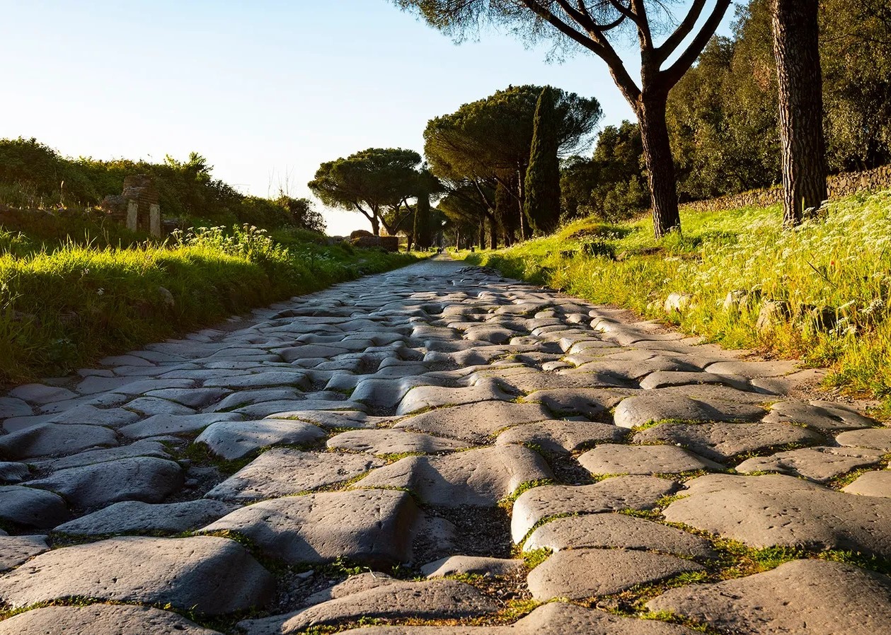 It's sunset in Rome, outside the city walls. Golden light filters through umbrella pines and casts its glow on a straight stretch of smooth basalt stones that changed the course of history. This is the Appian Way, the first road built in Rome, where more than 2,000 years ago soldiers set out to conquer distant lands and returned in triumph.