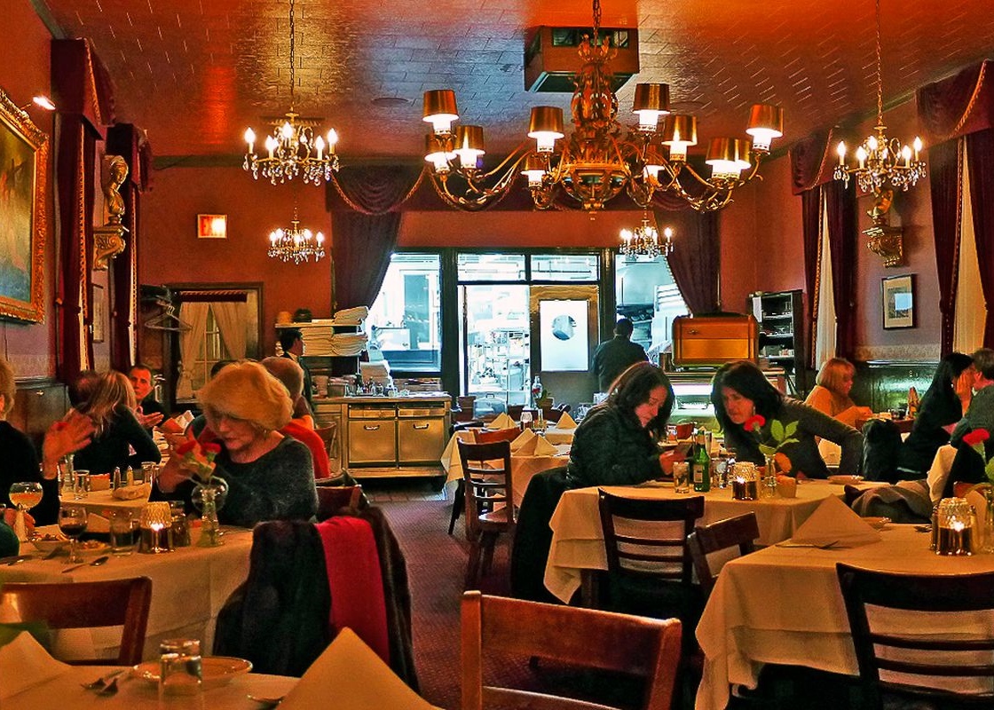 I think the best place for you and your mom is Bamonte’s. This venerable southern Italian restaurant in Williamsburg was founded over a century ago, but the decor definitely says 50s — and the crowd will make it feel old-school, too. You’ll still see old-timers with impressive hairdos and priests with clerical collars among the guests. The dining room is lined with oil paintings and Roman sculptures, and the tables are big and comfortable. The service is attentive and old-fashioned.