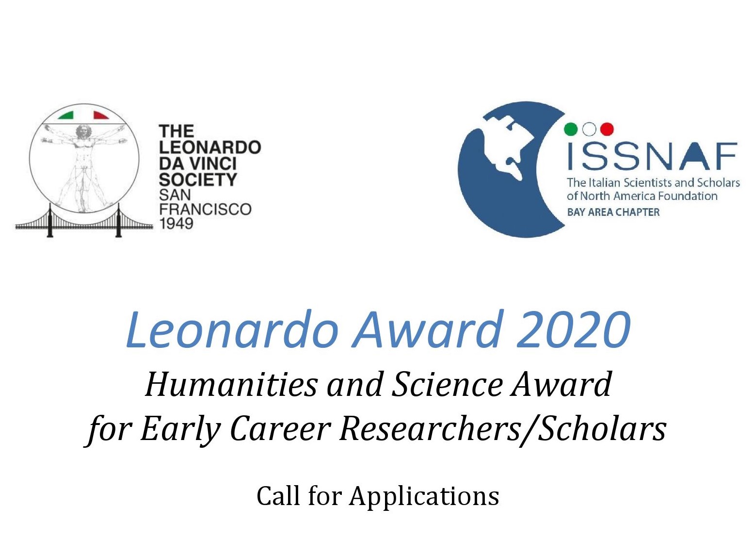 The Leonardo da Vinci Society and the Italian Scientists and Scholars of North America Foundation (ISSNAF) Bay Area Chapter are seeking applications for the Leonardo Award 2020 . This award was established in 2019 on the 500th anniversary of Leonardo da Vinci’s death to recognize the outstanding contributions of Italian/Italian American early career researchers/scholars working in the San Francisco Bay Area .