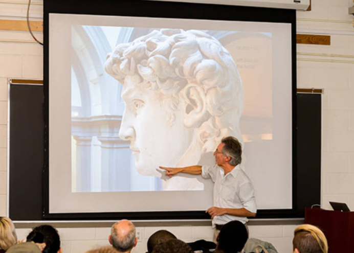 From Kean University: Professor and researcher in geological studies at the University of Siena in Italy Marco Giamello shared insights on the science of art with Kean University's Fine Arts Conservatory students. In a guest lecture, he presented observations from his studies of the masterpieces of Tuscan sculptors, including Michelangelo's David and Tino di Camaino's Triptych.