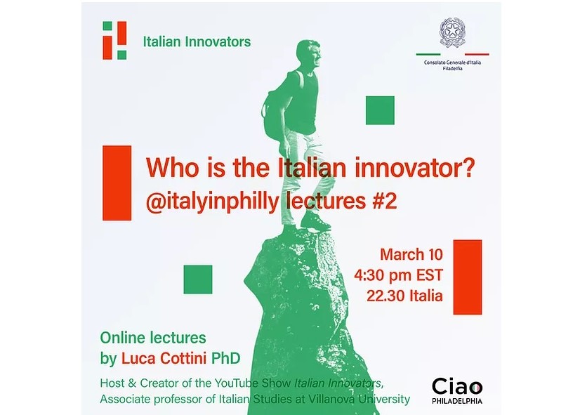 March 10. Time: 4:30 pm ET. The lecture is part of the 2021 @italyinphilly lecture series, sponsored by the Consulate General of Italy in Philadelphia in collaboration with Ciao Philadelphia and the YouTube show Italian Innovators. Register online here.
