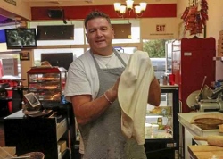 De Marco's' décor exudes old-fashioned good cheer — red-checked tablecloths, a bar surrounded by lights, black and white photos of New York celebrities. There's a counter showcasing pizza by the slice and a selection of desserts. Behind the counter co-owner and chef Stephen De Marco Jr. is at work, shaping, pounding, slathering and thrusting the pizza pies into industrial strength ovens.