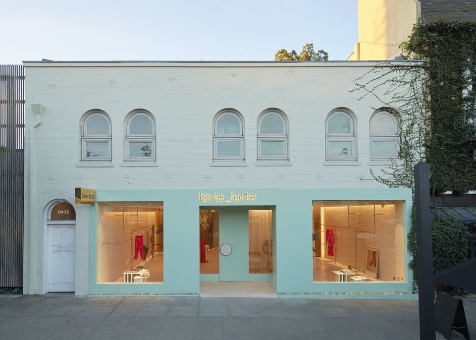 Italian contemporary label Forte Forte has opened its first U.S. store on Melrose Place in Los Angeles. Located at 8424 Melrose Place, the boutique was designed by co-founder Giada Forte and Robert Vattilana, art director and Giada’s life partner, on the ground floor of a 1930s building, characterized by two shop windows that open onto the street and framed by a sage green enamelled metal facade.