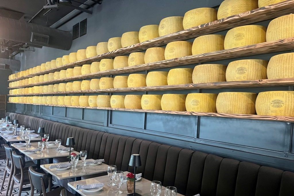 The one-year-old Vincenzo Cucina & Lounge in the heart of Little Italy houses the largest number of imported cheese wheels in San Diego. About 100 of the 40-pound wheels dominate a back wall in the spacious, main dining room. More can be found in the restaurant’s “cheese bar,” where the wheels are carved into bowl-shaped vessels for tossing in cooked pasta before it is plated.