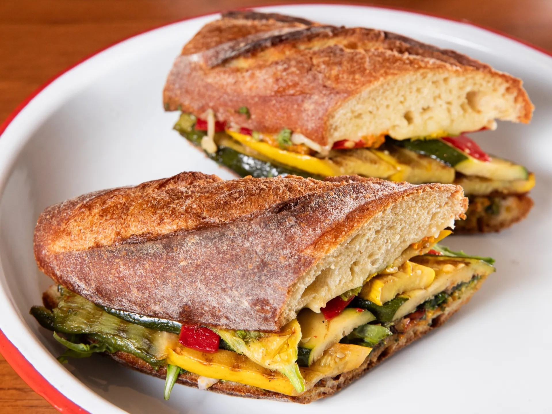 Or take the seasonal zucchini panino, which combines sliced summer squash and tender squash blossoms with German Grandamer cheese and Spanish piquillo peppers. Barbone also recently added a California-ized version of smørrebrød, the Danish open-faced sandwich, that layers the fancy French egg salad called gribiche with oily tinned mackerel, Calabrian chile and Sichuan peppercorns.