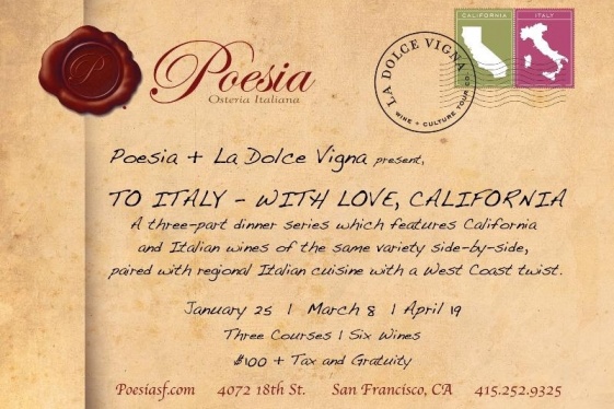 March 8 & April 19 - To Italy - With Love, California. A series of three dinners organized by La Dolce Vigna for Poesia Osteria which feature California and Italian wines of the same variety side by side, paired with regional Italian cuisine with a West Coast twist. Wednesday, March 8, 2017 and Wednesday, April 19, 2017. Poesia Osteria -- 4072 18t...