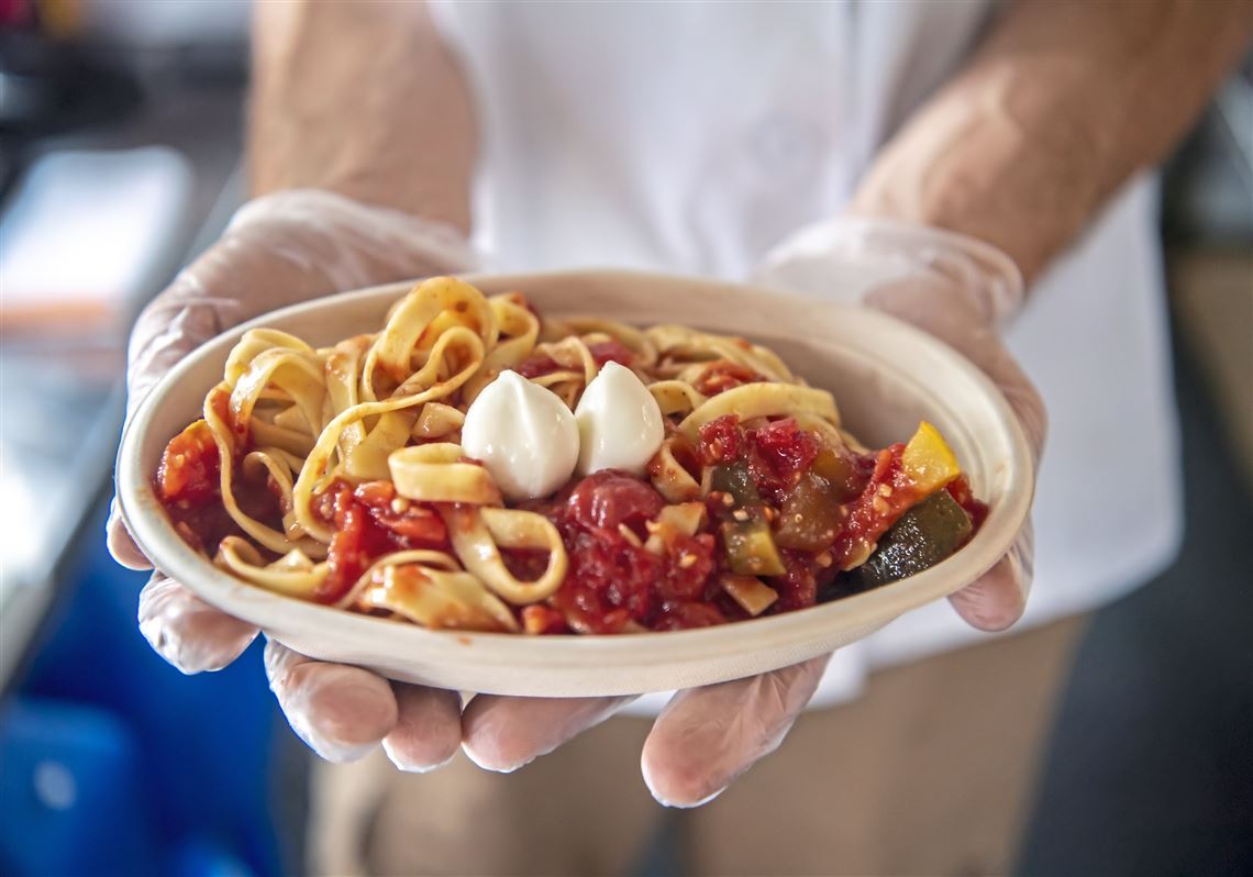 There’s a saying in journalism that one should never bury the lede, so I’ll skip the pleasantries and get right to it: I’m eating pasta tossed with cantaloupe that was made in a purple and red trolley.