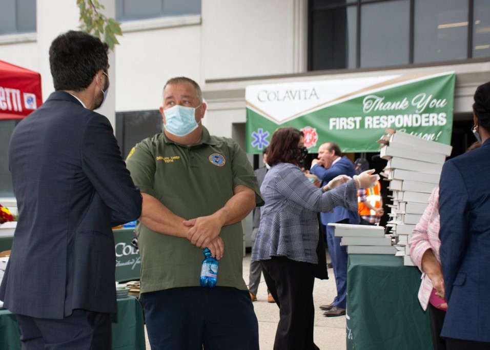 First responders and town officials were treated to fresh, handmade pizza at Colavita headquarters in Edison on Oct. 21 as part of the Italian brand’s efforts to give back to the community it calls home. Police officers, firefighters, EMTs, Mayor Thomas Lankey, Police Chief Tom Bryan, Fire Chief Bryan Latham and several council members, among others, gathered outside Colavita’s offices at noon to pick up a few wood-fired slices at their pizza truck.