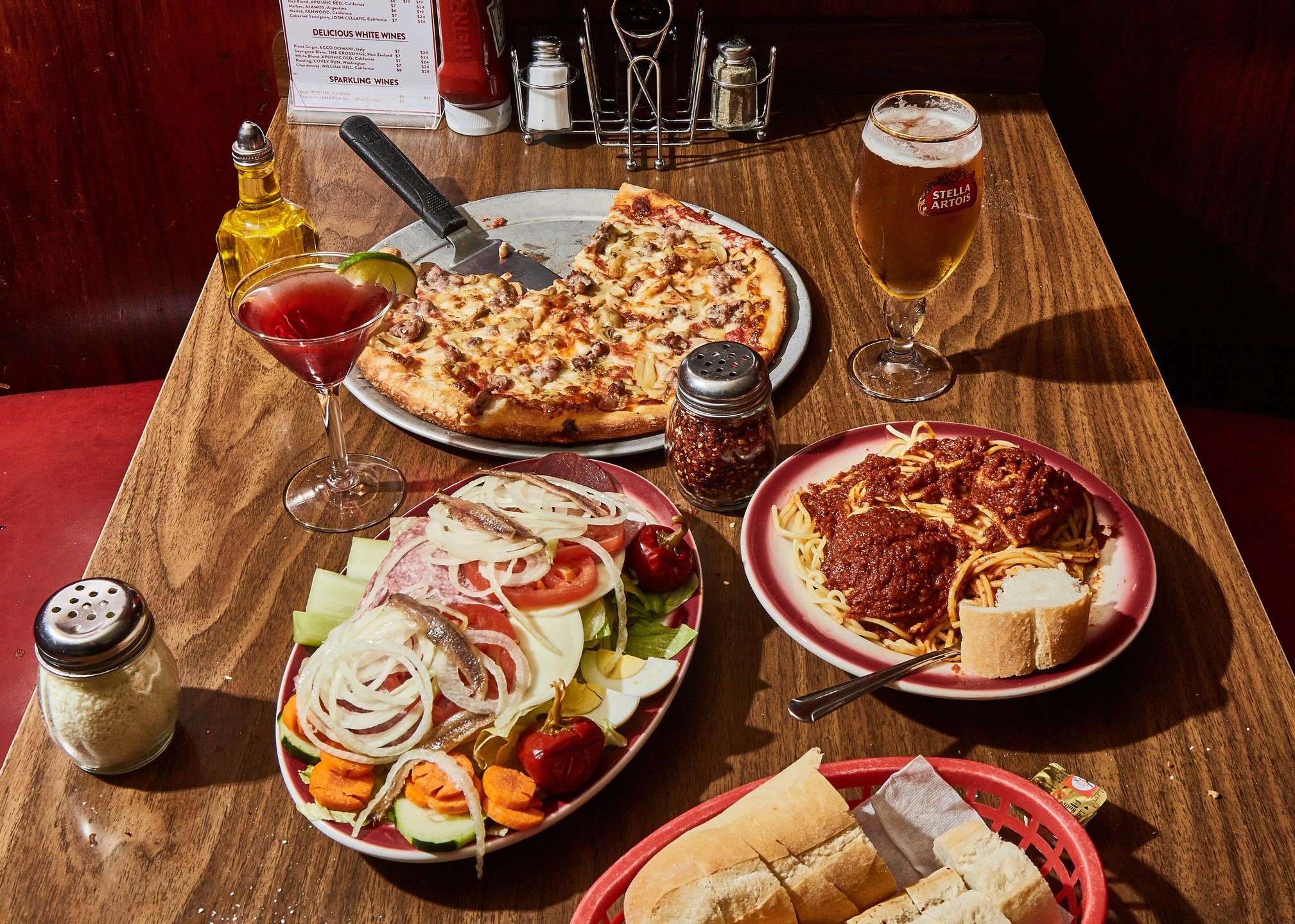 When I think of Tony’s, I think of red. Red-rimmed plates, red plastic baskets filled with crunchy-on-the-outside, pillowy-soft-on-the-inside Italian bread, and most importantly, the red sauce. Scattered between all the red baskets are white ramekins of grated Parmesan.