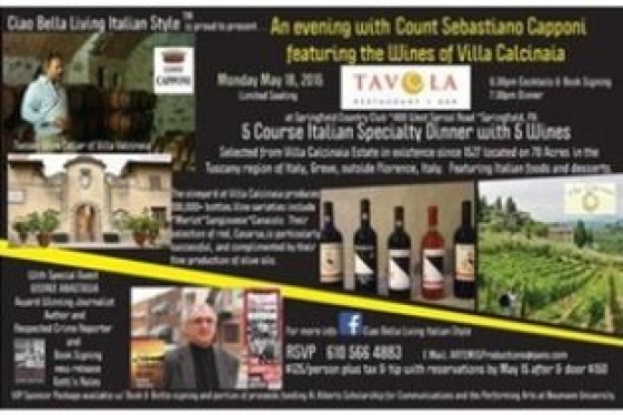 May 18, 2015 Monday 6:30 PMTavola Restaurant & Bar - 400 W Sproul Road - Springfield, Pennsylvania 19064 Come enjoy a five course Italian Specialty Dinner with five different wines selected from Villa Calcinaia Estate, which has been in existence since 1527 located on 70 acres in the Tuscany region of Italy. Enjoy a book signing...