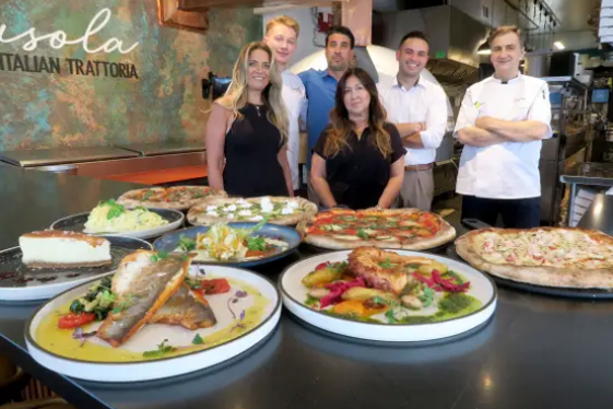 The team behind Isola, a new Italian restaurant in Beach Haven. From left to right in the back appears executive pizza chef Dylan Walenciak, co-partner Mario Famularo, general manager and co-partner Tony Marinho, executive chef Ermelindo Firmani, and (in front) team members Rosa Luisi and Marysol Duffy. A Pinoli pizza (pine nuts, Fior di Latte, Ric...