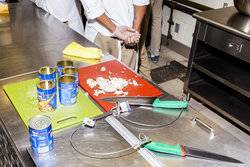 Abate's kitchen operates like a well-oiled machine: Gelato churns in the soft-serve machine while the pizza oven spits out bubbly pies in a matter of minutes. But pick up a knife and you'll notice it's chained to the counter. Open a couple aluminum cans and expect the lids to be counted and removed.
